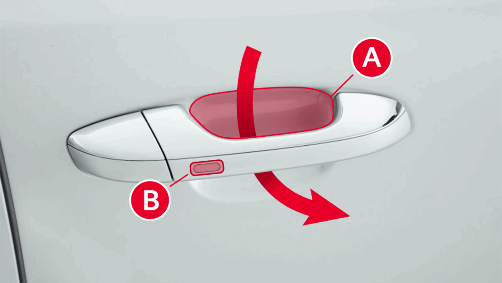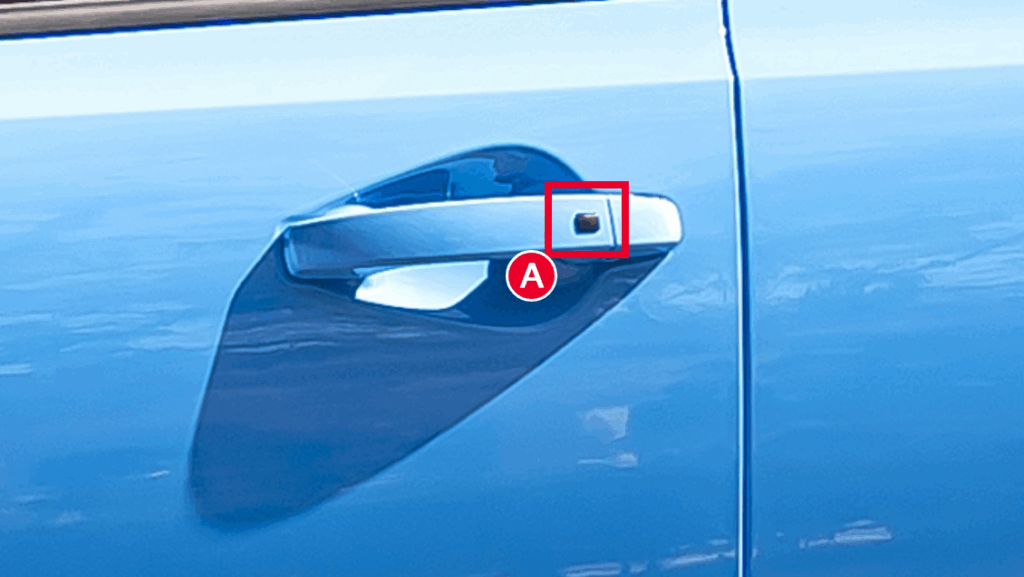 These handles include a physical button (A) on the driver and front passenger doors that controls locking and unlocking.