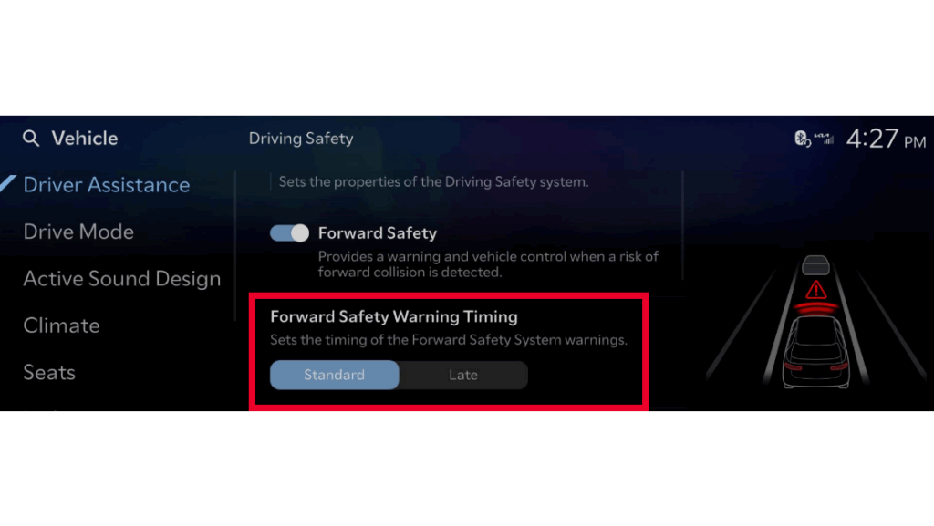 Publicaciones de KIA P2M Favorito Asistencia para evitar colisiones frontales* Se muestra el EV6 2026. Asistencia para evitar colisiones frontales* (FCA), solo con fines ilustrativos. Asistencia para evitar colisiones frontales* El sistema FCA está diseñado para detectar ciertos objetos que se encuentran delante y puede advertir al conductor de una posible colisión mediante una alerta en el panel de instrumentos y un sonido de advertencia. En ciertas situaciones, el FCA...* También puede aplicar asistencia de frenado para ayudar a reducir la gravedad de una colisión. *El funcionamiento puede variar según el modelo. Cómo activar la FCA* Encendido o apagado Para acceder a FCA* Controles en el sistema de infoentretenimiento: Seleccionar Vehículo Seleccionar Asistencia al conductor Seleccionar Conduciendo Seguridad Elegir Adelante Seguridad para activar o desactivar la función Ajuste de FCA* Tiempo de advertencia Puedes personalizar la anticipación con la que FCA* alerta al conductor: Estándar: Use el modo Estándar en condiciones normales de conducción. Si la sincronización de la advertencia parece sensible, cambie a Tarde. Tarde: Si se selecciona Tarde, FCA* avisará al conductor más lentamente. Configuración de audio de prioridad de seguridad al conducir Para FCA* y otras funciones ADAS, el sistema puede reducir automáticamente otras fuentes de audio cuando se activa una alerta de seguridad. Para habilitar o deshabilitar esto: Seleccione el Volumen icono en la pantalla de Asistencia al conductor Palanca Prioridad de seguridad al conducir Echa un vistazo a la Asistencia para evitar colisiones frontales Vídeo sobre las características y funciones de Kia en YouTube™* Canal para profundizar en esta función. * Información de seguridad importante y exenciones de responsabilidad legal se pueden encontrar en el enlace en la parte inferior de la página. ADAS Experiencia del cliente La satisfacción del cliente IQS Ventas Servicio Más publicaciones sobre Kia P2M